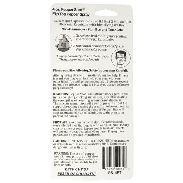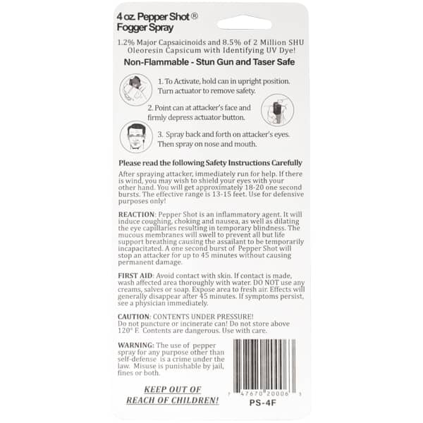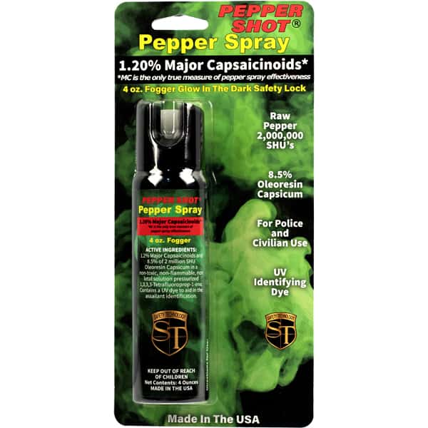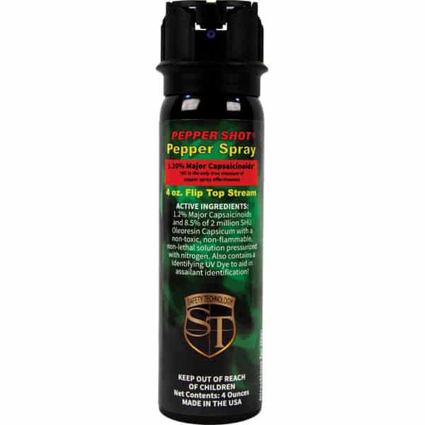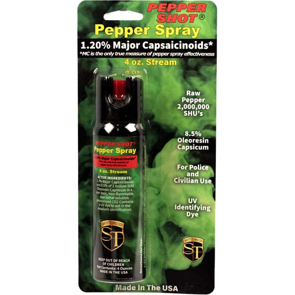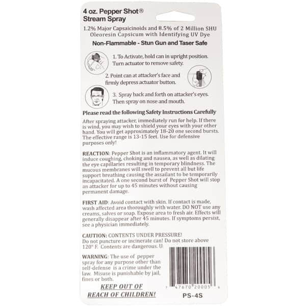 Experience peace of mind with the Pepper Shot 1.2% MC 4 oz pepper spray stream. Designed specifically for protection and safety, this pepper spray is made from 1.2% Major Capsaicinoids, the true measure of heat, to cause extreme pain and discomfort to your attacker. It also contains 8.5% oleoresin capsicum formula for maximum swelling of mucous membranes and veins in the eyes, causing them to close so you can get away safe. This pepper spray has a range of up to 15 feet and 18-20 one-second shots before needing a refill. With its UV identifying dye you can quickly identify attackers and its convenient size easily fits into it’s included leatherette holster with belt clip for easy carrying. Get the protection you need in any situation with Pepper Shot 1.2% MC 4 oz pepper spray stream!
