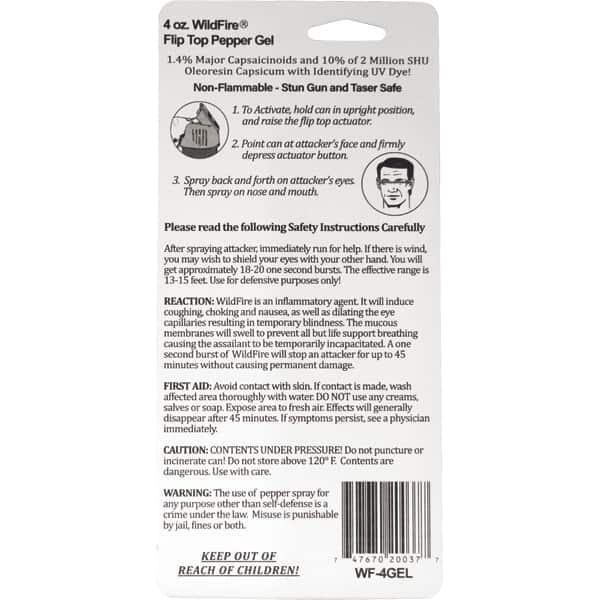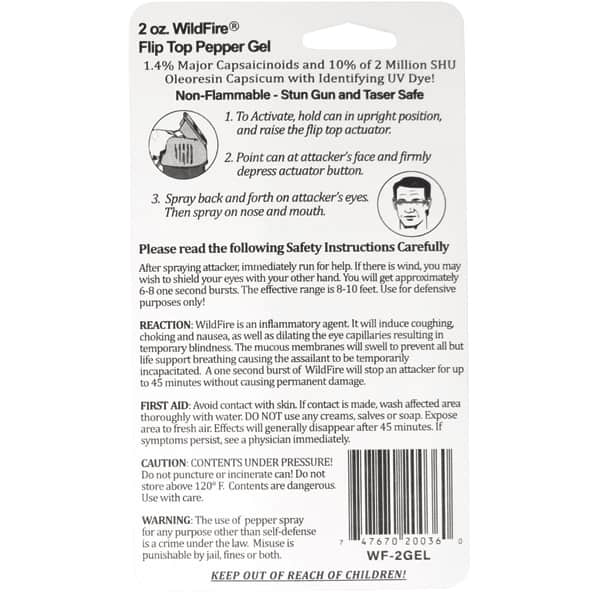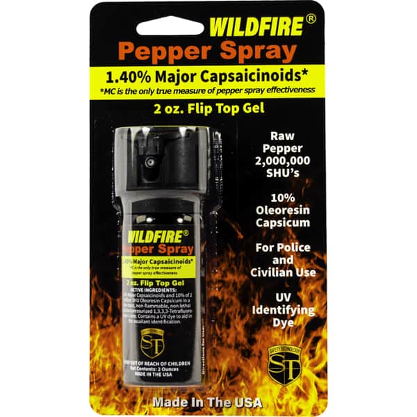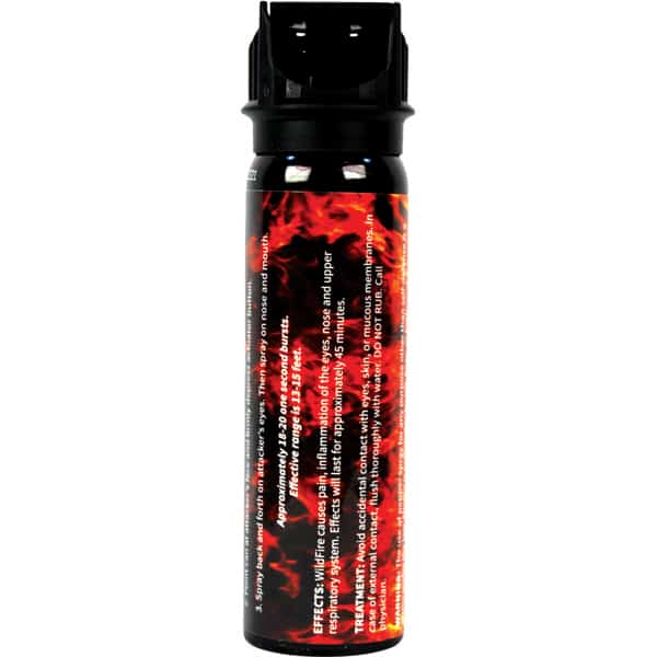 The WildFire WF-GEL pepper gel spray gives you powerful protection from an attack with the highest heat level available; 1.4% major capsaicinoids. It causes an attacker extreme pain, swells their mucous membranes to cause difficulty breathing, and swells the veins in their eyes so they can’t see. These effects can last up to 45 minutes and cause no permanent damage. The nonflammable formula also contains a UV identifying dye to help identify the attacker.